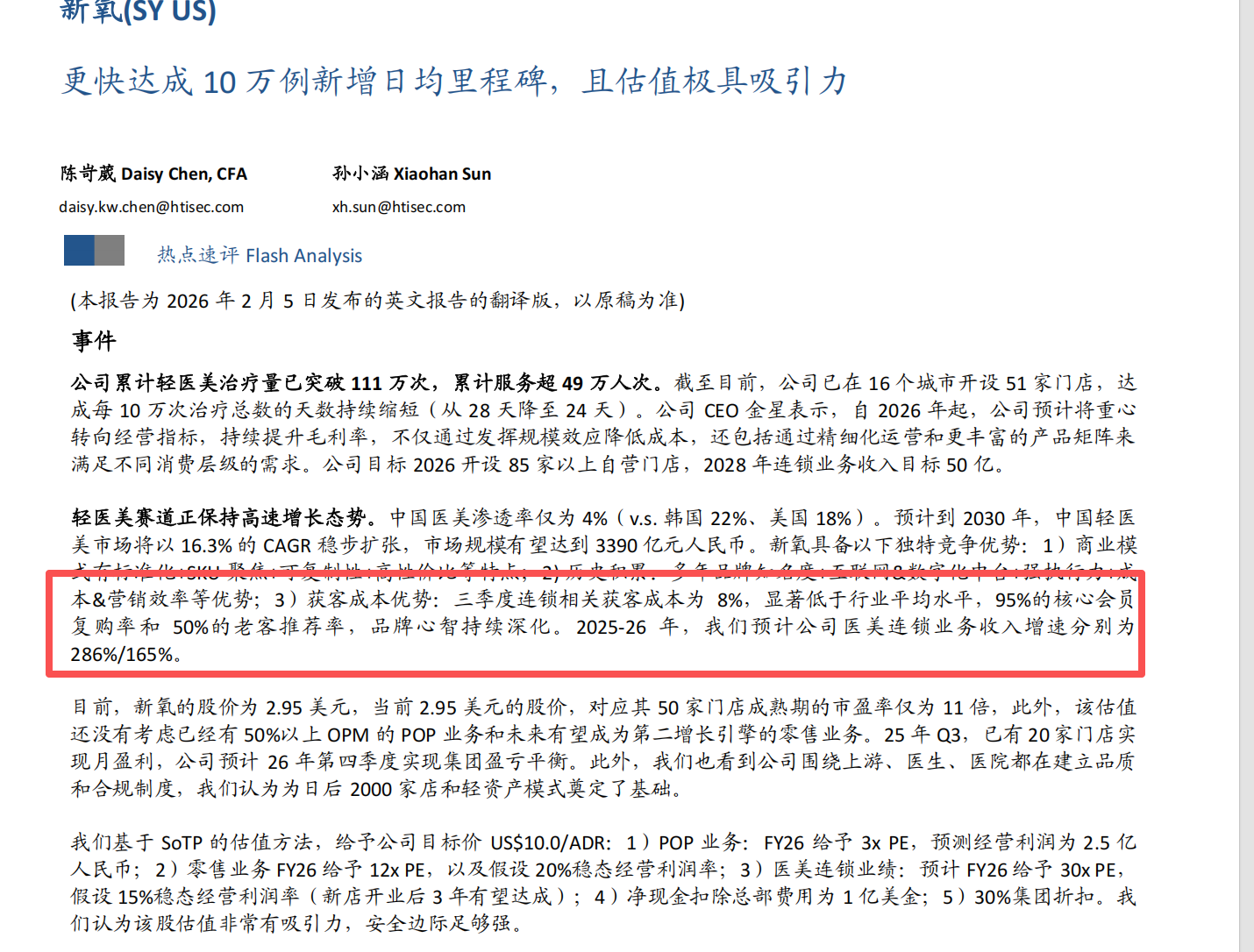 其一,门店规模方面,截至2025年底,新氧青春诊所已开设49家轻医美门店,门店数量位居全国轻医美连锁品牌第一位。